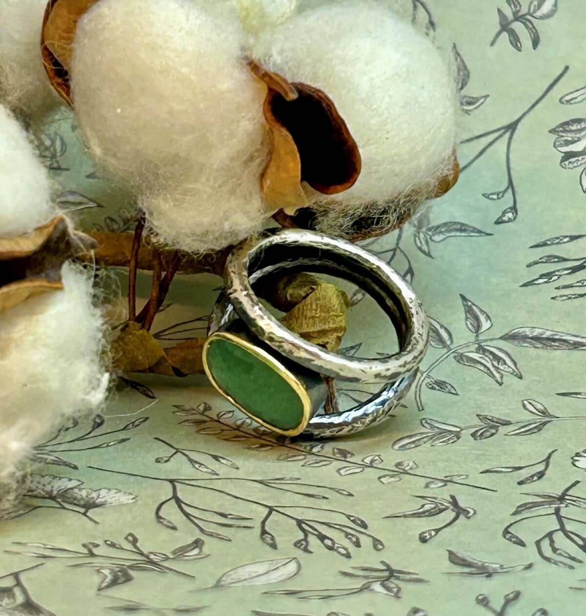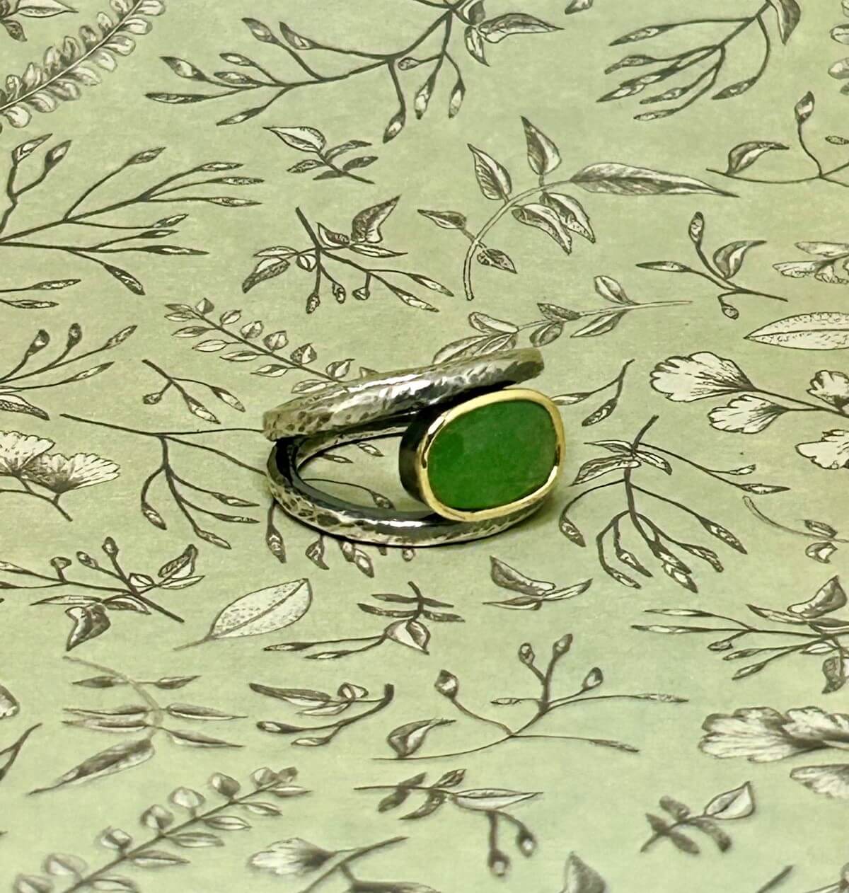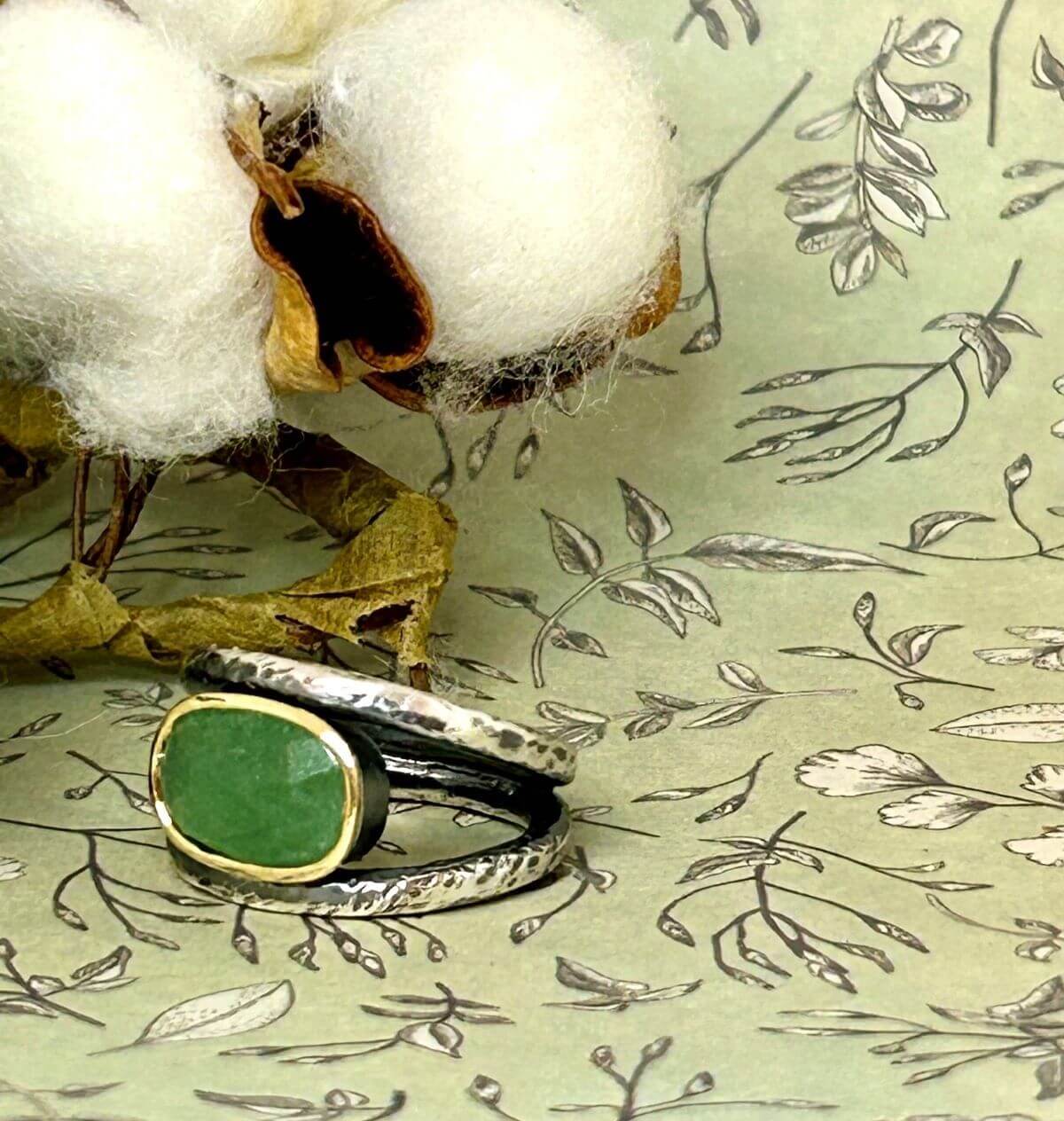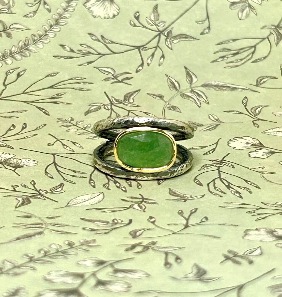 Anell doble de plata 925 envellida, amb aventurina verda ovalada encastada en or groc de 18K, amb mida d’1,5 cm x 1 cm.
