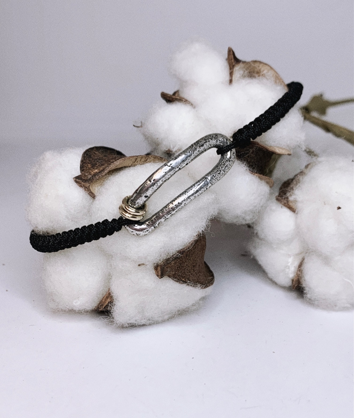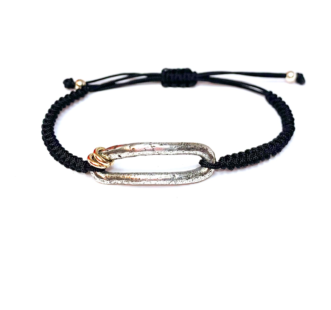 Braçalet amb peça de plata 925 ovalada de 3 cm de diàmetre i un cm d’amplada, amb dues anelles d’or groc de 18 Kt.