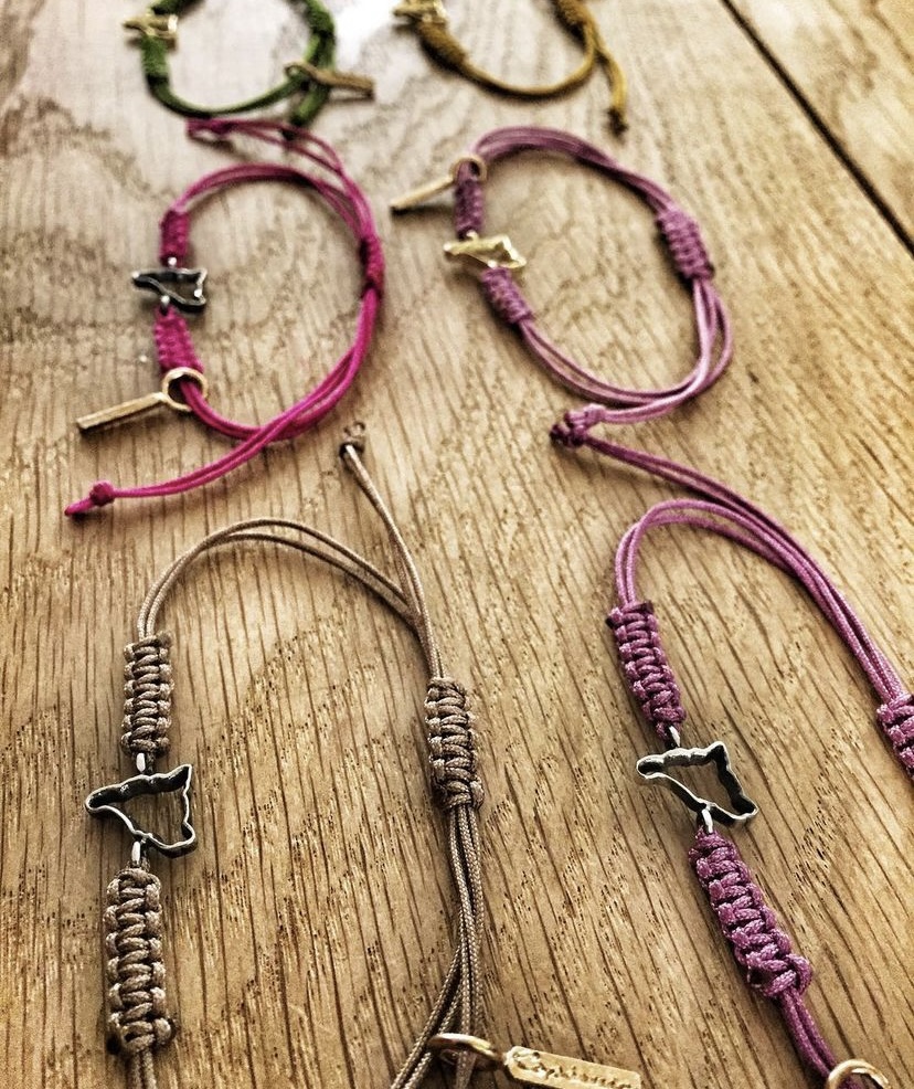 Braçalet d’or groc (18 kt) amb forma de Catalunya (diàmetre 1 cm) i fil de niló extensible de diferents colors.