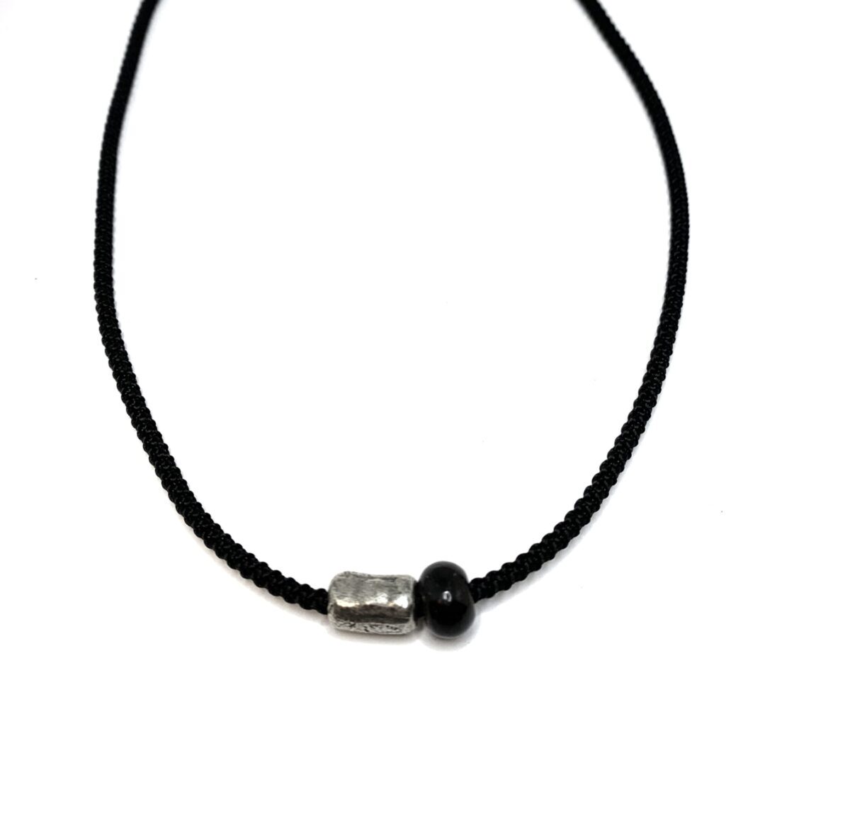 Collaret amb cordó negre (llargada: 45 cm), boleta d’ònix i cilindre allargat de plata 925 envellida ( 1 cm).