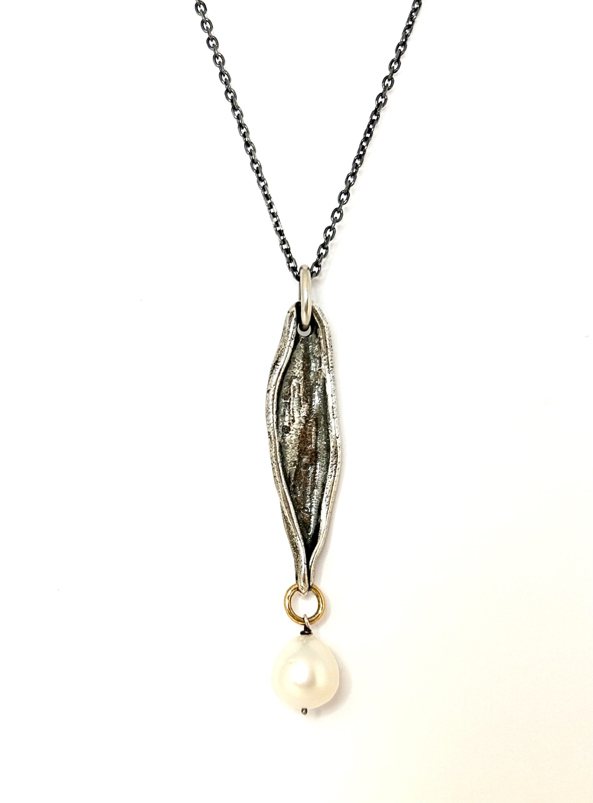 Collaret llarg amb cadena de plata 925 envellida, penjoll de plata 925 amb forma de fulla, anella d’or groc de 18 kt i perla australiana.