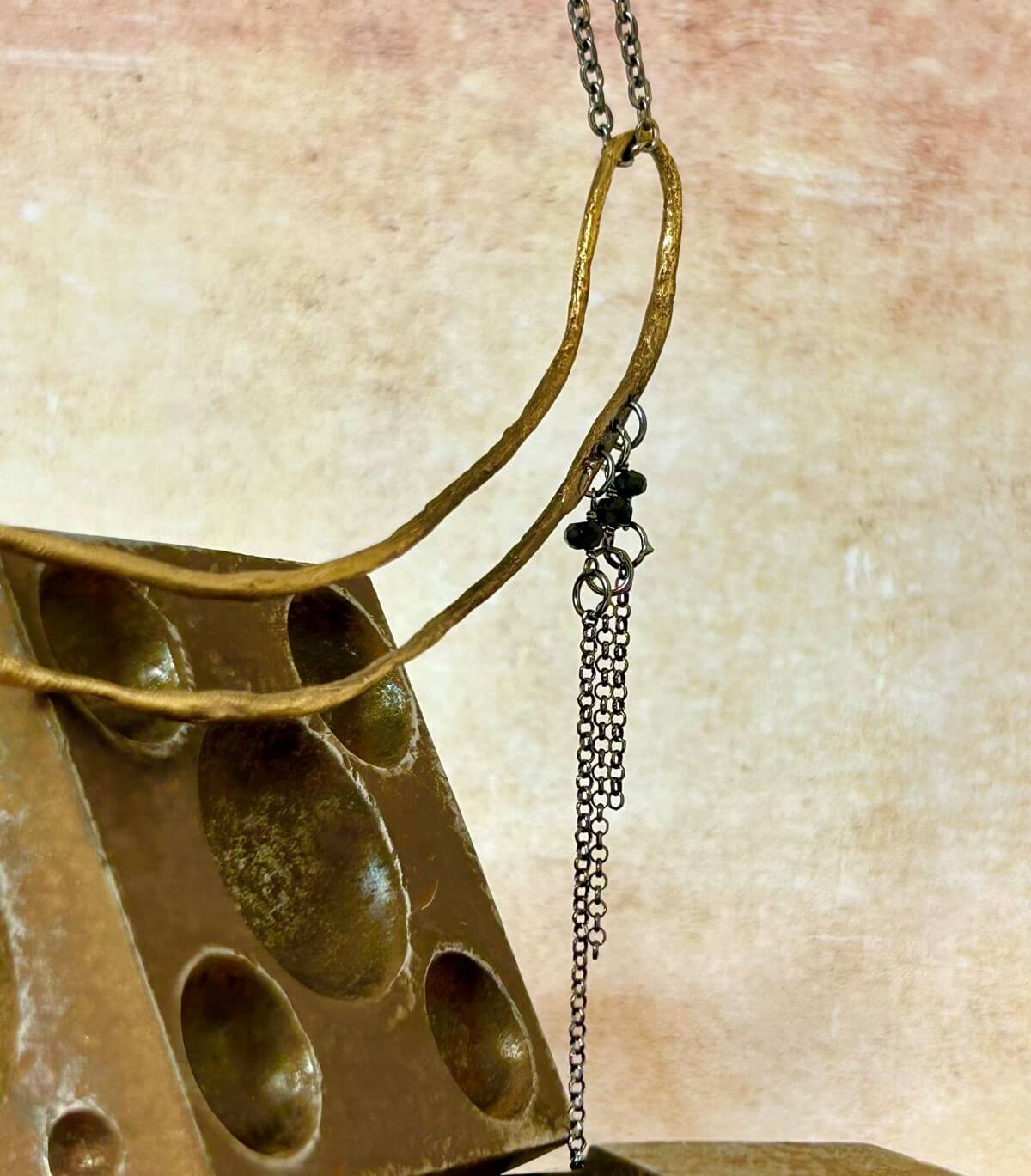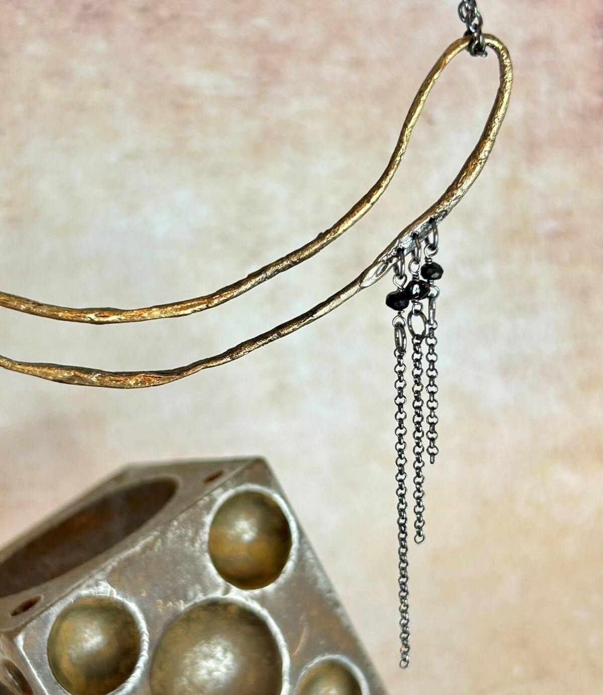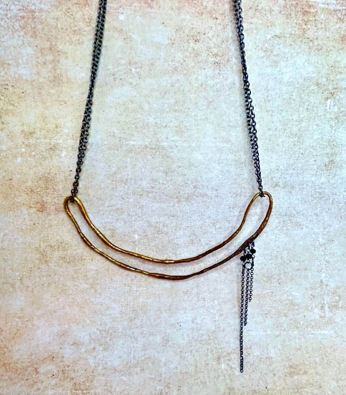 Collaret curt amb doble cadena de plata envellida 925 i anella allargada circular de bronze (diàmetre 12 cm).