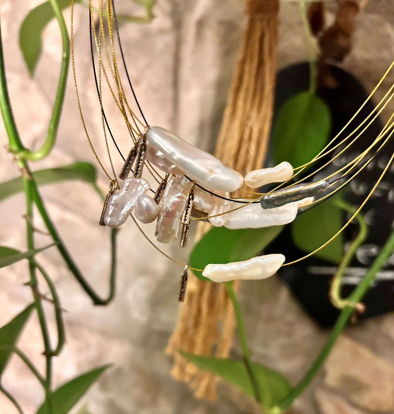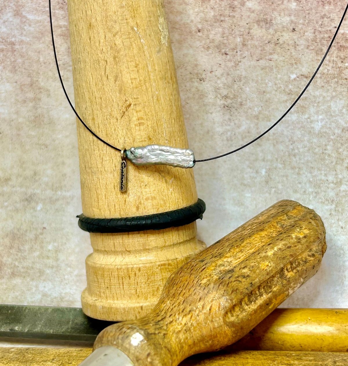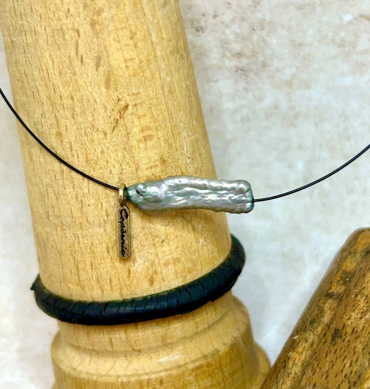 Collaret amb cable d’acer negre (42 cm) i perla natural d’aigua dolça grisa, amb forma allargada.