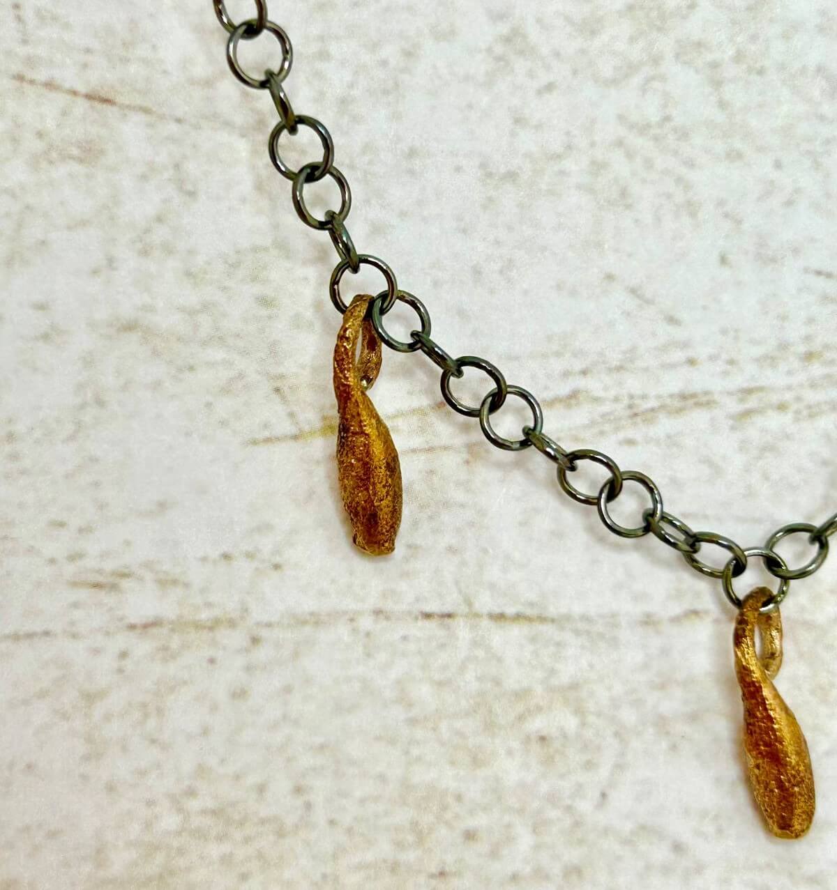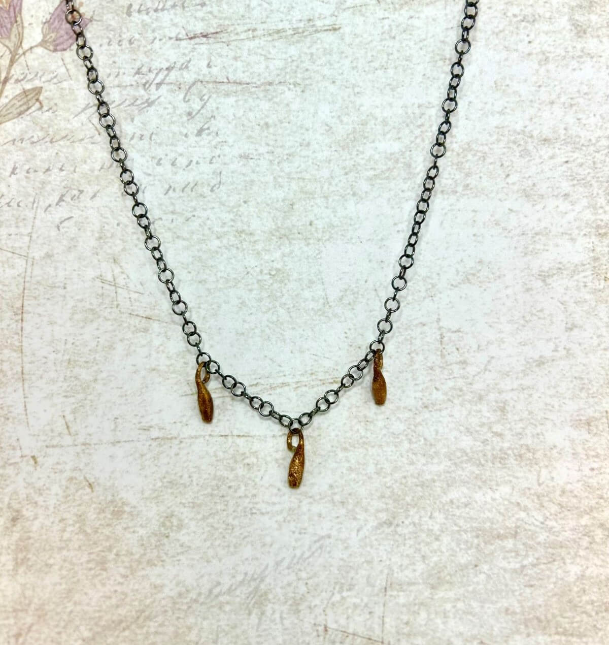 Collaret amb cadena de plata envellida 925 i tres penjolls petits de bronze amb forma de llavor.