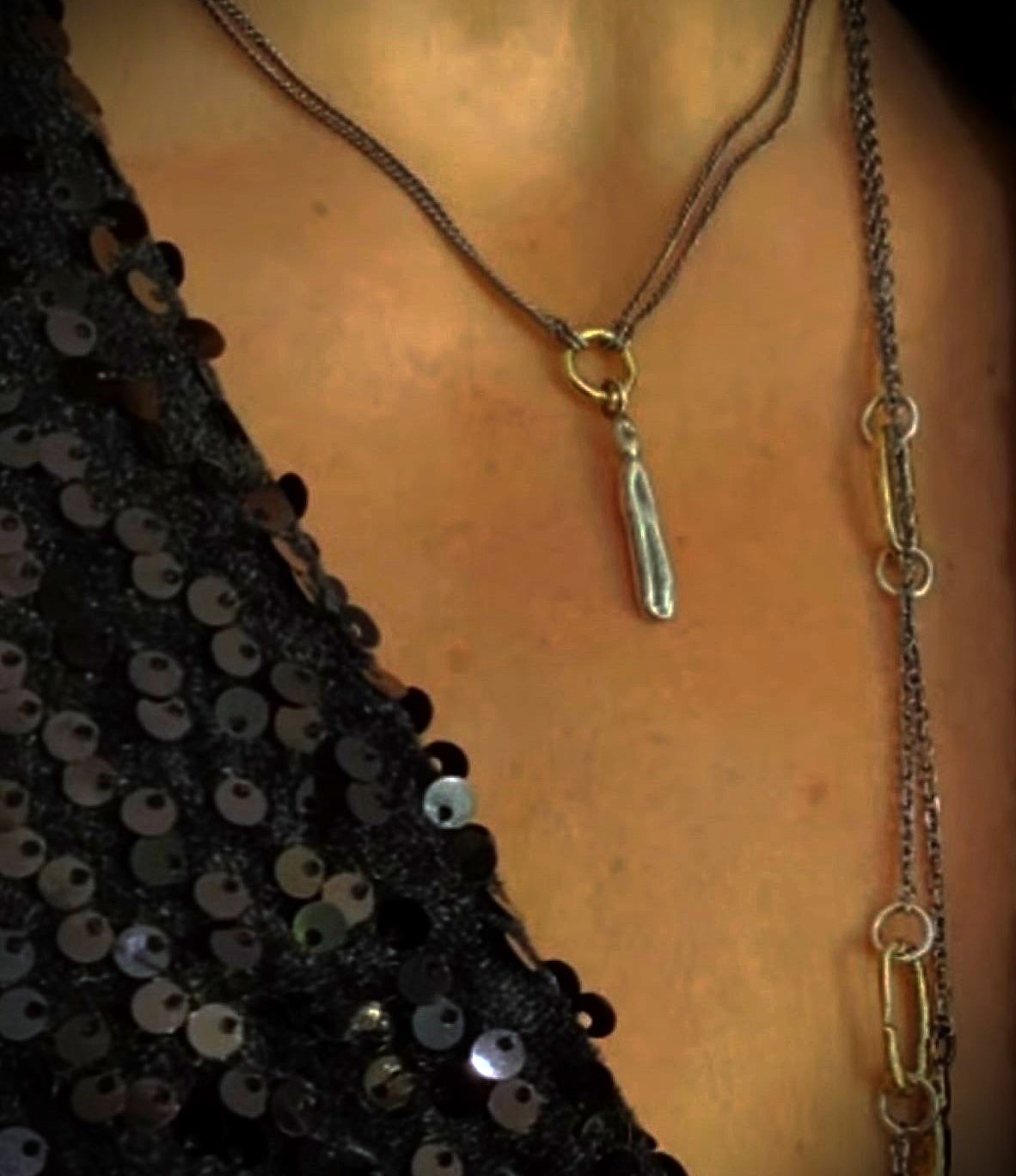 Collaret doble cadena, amb penjoll de plata 925 envellida i anella d’or groc (18 kt) d’un cm de diàmetre.